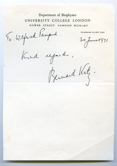 Eigenh. Albumblatt mit U. Wohl London, 30. Juni 1971. ? S. Gr.-8vo. ?Kind regards? an einen Sammler. ? Bernard Katz hatte i. J. 1970 gemeinsam mit Julius Axelrod und Ulf von Euler den Nobelpreis für Physiologie oder Medizin erhalten ?für ihre Entdeckungen der Signalsubstanzen in den Kontaktorganen der Nervenzellen und der Mechanismen für ihre Lagerung, Freisetzung und Inaktivierung?. ? Auf Briefpapier mit gedr. Briefkopf ?Department of Biophysics | University College of London?.