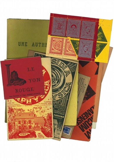 "Sammlung ""Pataphysique""" Paris 1964-66. "Umfangreiches Konvolut des besonders in den 1960er Jahren in Kunst und Literatur einflussreichen 'Collège de Pataphysique', das einen bis heute aktiven und lange Zeit geheimen Zusammenschluss von Wissenschaftlern, Literaten und Intellektuellen darstellt. Gegründet 1948 in Paris, als Vereinigung zur Förderung von Studien der ?Pataphysik?, einem vom französischen Schriftsteller Alfred Jarry (1873?1907) erdachten absurdistischen Wissenschaftskonzept. Der Begriff der Pataphysik wurde vom Schriftsteller Alfred Jarry im Theaterstück Roi Ubu als Persiflage auf die Naturwissenschaft geprägt. Das Collège hat eine esoterische Verfassung, die in ihrer Struktur und rätselhaften Sprache an Masonisches erinnert: denn wie in einer Loge gibt es unterschiedliche Grade der Mitgliedschaft. Das Collège benutzt intern eine eigene Zeitrechnung, die mit Alfred Jarrys Geburt am 8. September 1873 beginnt. - Neben einigen Heften mit wissenschaftlichen und literarischen Studien aus den verschiedenen vom Collège herausgegebene Schriftenreihen (siehe unten) auch mit diversen internen Veröffentlichungen (u.a: Troisième Manifeste / N?oubliez pas de renouvelez votre abonnement! / Èlection / Collection des Cahiers du Collège de Pataphysique / Institutum Pataphysicum Mediolanense (68 x 49 cm) / 1 gelaufenes Kuvert hs. adressiert an den österr. Schriftsteller u. Mitredakteur der Literaturzeitschrift ?Eröffnungen? Hannes Schneider von R[aymond] Fleury A.O.G.C.O.E. du Collège de Pataphysique [] (Stemp.). Enthält u.a. ein 'Carnet-Spécimen' mit 23 Marken / Timbres auf 4 Bll.; 1 Theaterzettel (2fach) für die Aufführung eines Stückes von Jarry (1966 im Theatre Kaleidoscope in Paris). - Umfasst folgende Werke aus den Schriftenreihen: I: Ferry, Jean. Une autre Étude sur Raymond Roussel. Leçons de Petit Apparat sur les Chants I, III, & IV des Nouvelles impressions d'Afrique, professées en la susdite Chaire durant les années 88 & 89 E.P (= Collège de Pataphysique XCI). [Paris], Collège de Pataphysique (11 gidouille 91 [= 25 Juni 1964]). Gr.-8°. Reihentit., Tit. 48(6) S. Mit einigen kl. Textabb. Gelber OKart. Einbd. etw. angestaubt. - Eines von 888 Ex. (eines von 555 auf Simillimi-Chiffon) 'pour les Membres dudit Collège'. / II: Jarry, Alfred. Les Les Antliaclastes. Drame en trois actes. (Colle?ge de 'Pataphysique XCII). Saint-Brieuc, (Colle?ge de Pataphysique / Imp. Firmin-Didot 1964). 8°. 28(2) S. OBrosch. Papierbed. gebräunt. ? Nr. 358 von 666 Ex. / III: Petitfaux, Georges. Petit A-B-C de quelques idées reçues parmi les Membres du Collège de Pataphysique pour les commodités de la conversation. (Colle?ge de 'Pataphysique XCIII; Collection des Phynances III). [Paris], Collège de Pataphysique 29 clinamen 93 [= 19-20 April 1966]). Quer-8°. 35(3) S. OBrosch. - Eines von 999 Ex. (Nr.348 v. 377 ?Exemplaire de luxe sur Grand Papier bleu & numerotés?). / IV: Subsidia pataphysica. Troisième et nouvelle série. Numéro 0 et numéro 1. Paris, Collège de 'Pataphysique 28 tatane XCII E.P. [= 1965] u. 29 sable 93 E.P [=1965]. 8°. 84 u. 103(1) S. Illustr. OKart. - Die ersten 2 von 28 Heften. / V: Daumal, René u. Roger Gilbert-Lecomte, Le lyon rouge suivi de La tempête des cygnes ou La conquête des signes. (= Collection Haha. 91). [Paris], Collège de Pataphysique XCI E. P. [= 1964]. 10,5 x 10 cm. 21(3) S. Illlustr. OBrosch. - DIFFERENZBESTEUERT".