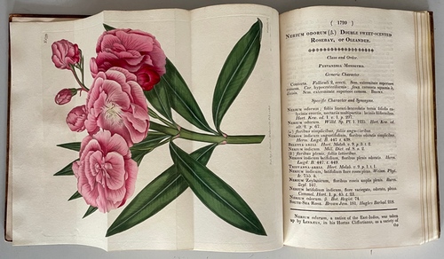 Curtis's Botanical Magazine; or Flower-Garden displayed: in which The most ornamental Foreign Plants, cultivated in the Open Ground, the Green-House, and the Stove, are accurately represented in their natural Colours. To which are added, Their Names, Class, Order, Generic and Specific Characters, according to the celebrated Linnaeus; their Places of Growth, and Times of Flowering; Together with the most approved Methods of Culture. A Work Intended for the Use of such Ladies, Gentlemen, and Gardeners, as wish to become scientifically acquainted with the Plants they cultivate. By John Sims, M. D., Fellow of the Royal and Linnean Societies. Vol. XLIII. Being the First of the New Series. London: Printed by Stephen Couchman; Published by Sherwood, Neely, & Jones. 1816. Mit 90 (davon 7 gefalt.) kolorierten Kupferstichtafeln. Unpag. Vorderdeckel lose, sonst sehr gutes Exemplar mit den schön kolorierten Tafeln.