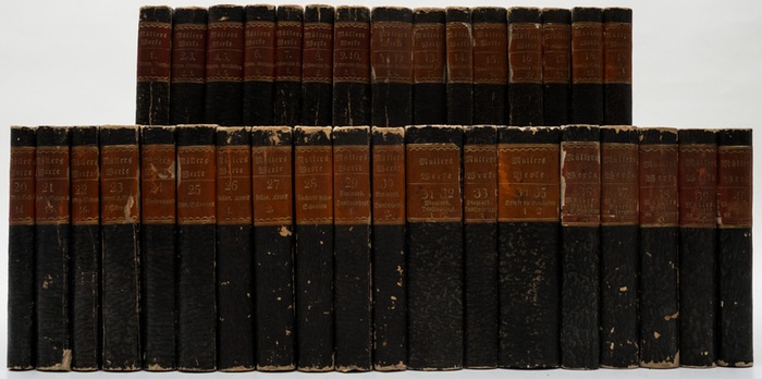 Sämmtliche Werke. - [40 Bände]. - Stuttgart; Tübingen:, Cotta, 1832-1835. 40 Bände in 34 Bänden: Ppbde. der Zeit, goldgeprägte rote Rückenschildchen, 13,5 x 9 cm. 40 Bände in 34 Bänden (die Bände 2/3, 4/5, 9/10, 11/12, 31/32, 34/35 in Doppelbänden). - (= vollständig). - Werkausgabe des schweizerischen Historikers, Schriftstellers und Diplomaten und persönlichen Freundes von Herder und Lessing (1752-1809). - Hg. von Johann Georg Müller. - Provenienz: Joachim Kersten (Rechtsanwalt und Literaturvermittler, 1946-2023; Nachlassexlibris auf dem vorderen Spiegel des ersten Bandes; datierter Namenszug auf dem vorderen fliegenden Vorsatzblatt des ersten Bandes). Einige Seiten mit Anstreichungen und Notizen Kerstens in zartem Bleistift. - Stärker berieben und bestoßen; das etwas spröde farbige Papier der Rückenschildchen teils mit kleinen Abplatzungen; teils mit der Andeutung von Flecken; gute Exemplare.